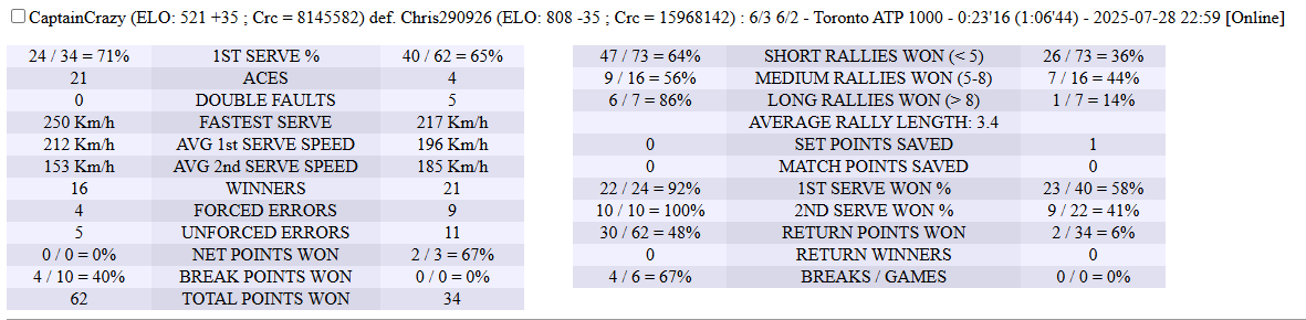 | 30.07.2025 | Quarter-Final | Parham | CaptainCrazy | 6-1,6-4 | |