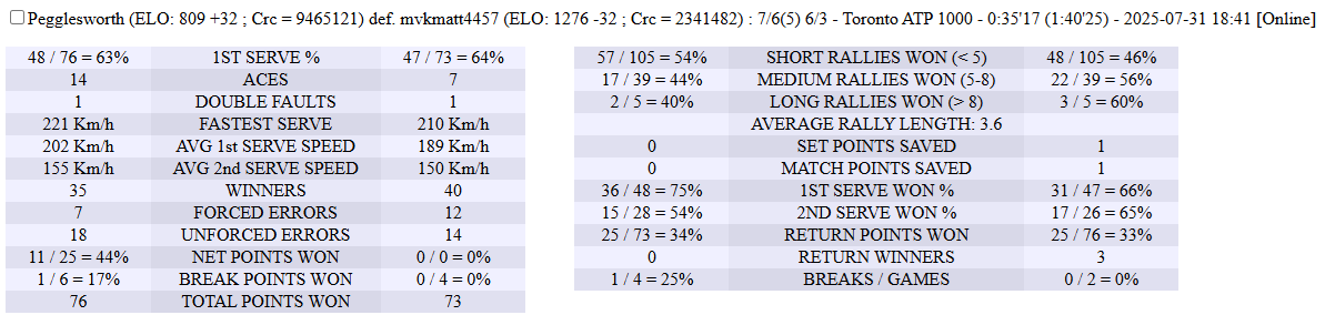 | 31.07.2025 | Semi-Final | Pegglesworth | mvkmatt4457 | 7-6,6-3 | |