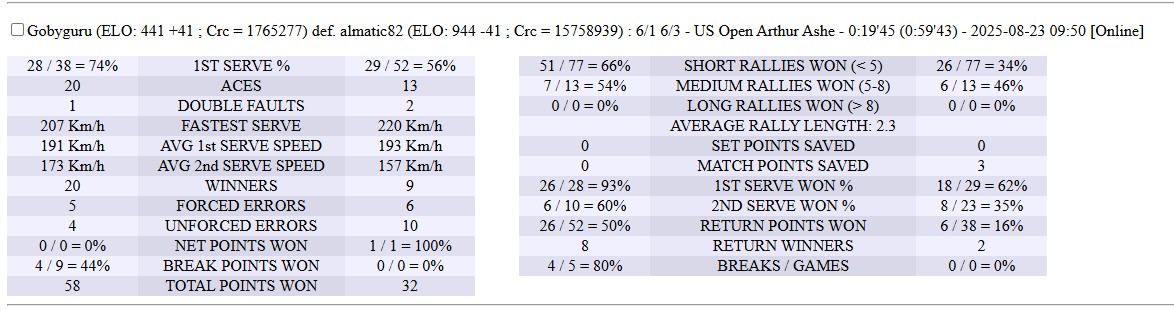 | 23.08.2025 | Round of 16 | Gobyguru | almatico | 6-1,6-3 | |