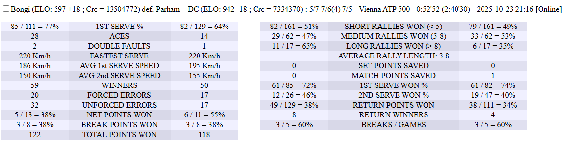 | 24.10.2025 | Semi-Final | Bongi | Parham | 5-7,7-6,7-5 | |