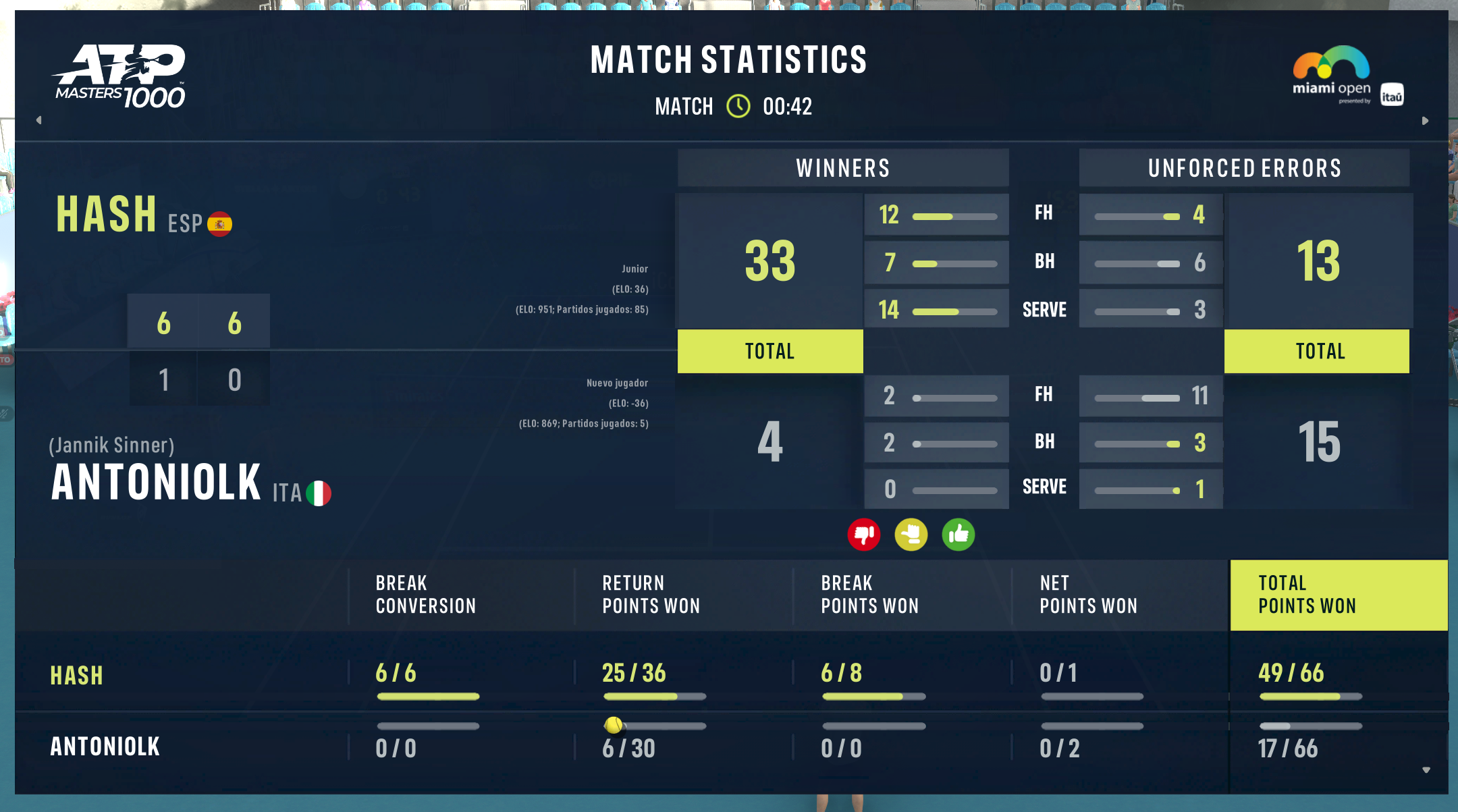 | 20.03.2026 | Round of 32 | Hash | antoniolk | 6-1,6-0 |
