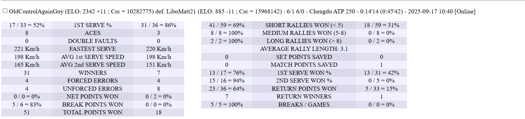 | 14.09.2025 | Round of 16 | JorgeCas567 | Rock | 6-3,6-3 | |