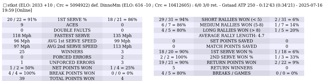 | 25.07.2025 | Final | fakefederer | Stkst | 6-2,6-1 | |
