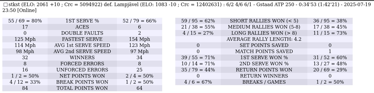 | 21.07.2025 | Semi-Final | Stkst | Lampjavel | 6-2,4-6,6-1 | |