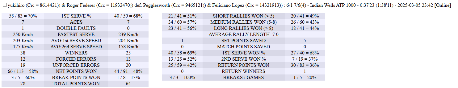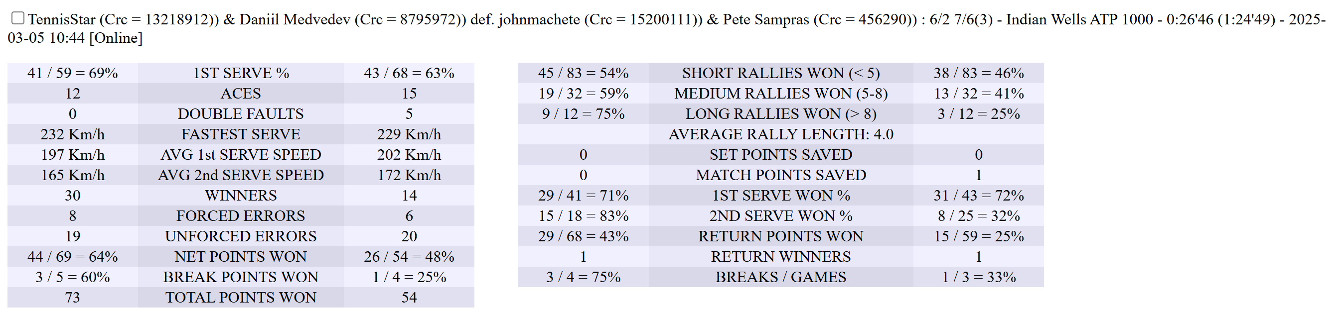 | 22.03.2025 | Semi-Final | Yukihiro | Tennis_Star | 4-6,7-5,01-7 | |