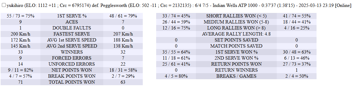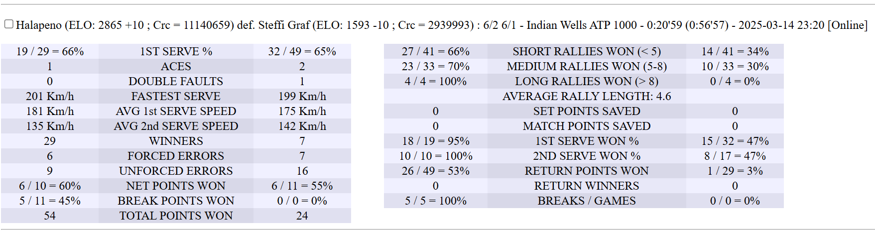 | 14.03.2025 | Quarter-Final | Halapeno | Tennis_Star | 6-2,6-1 | |