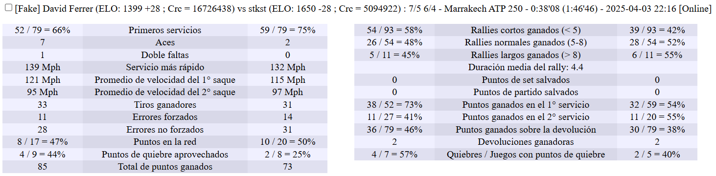 | 04.04.2025 | Quarter-Final | Madferit | Stkst | 7-5,6-4 | |