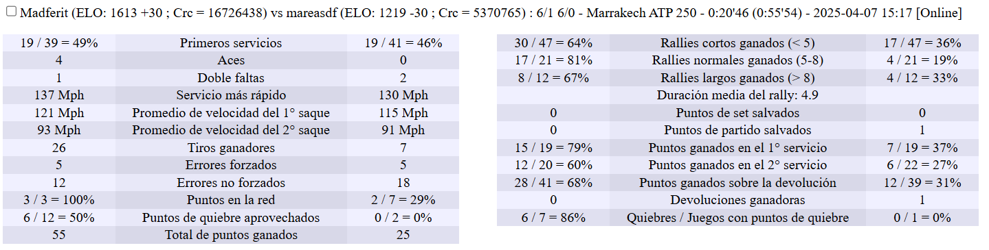 | 07.04.2025 | Final | Madferit | mareasdf | 6-1,6-0 | |