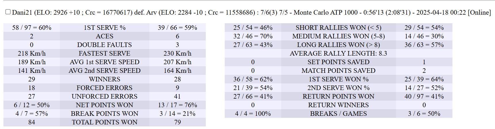 | 17.04.2025 | Quarter-Final | Dani21 | Arv | 7-6,7-5 | |