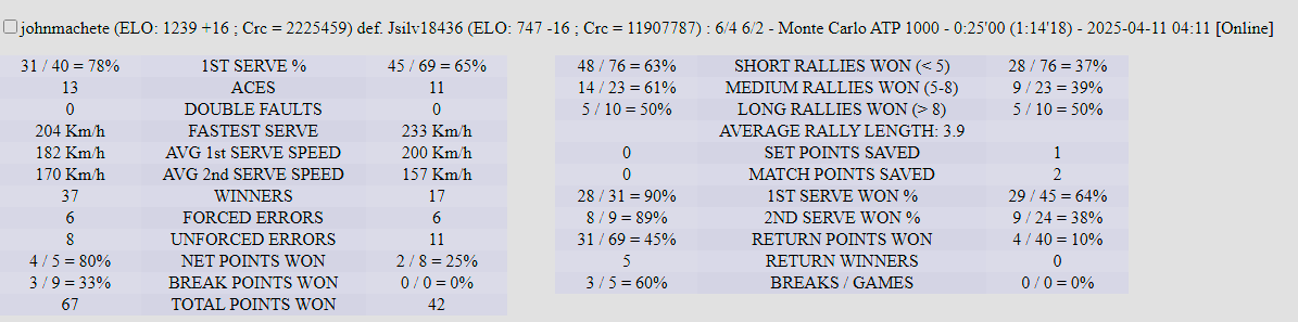 | 10.04.2025 | Quarter-Final | Franky Franchicha | jsilv1 | 6-4,6-2 | |
