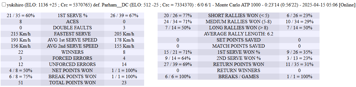 | 16.04.2025 | Semi-Final | Yukihiro | Lampjavel | 6-4,6-3 | |
