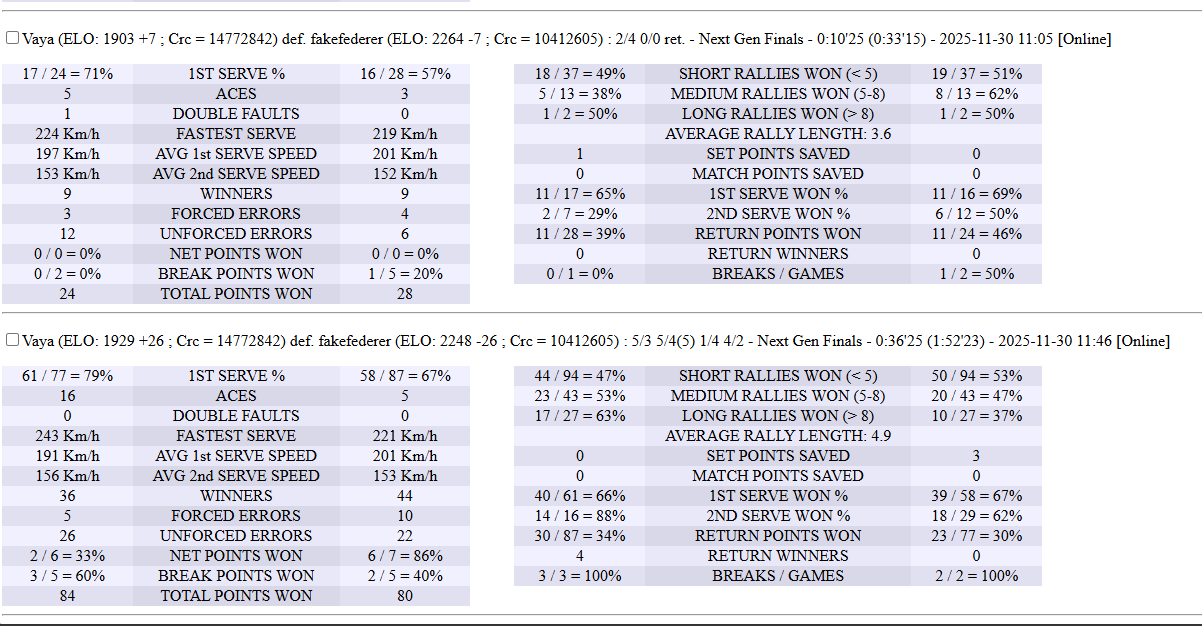 | 21.11.2025 | Round Robin | fakefederer | Vaya | 2-4,4-1,1-4,4-2,4-1 | |