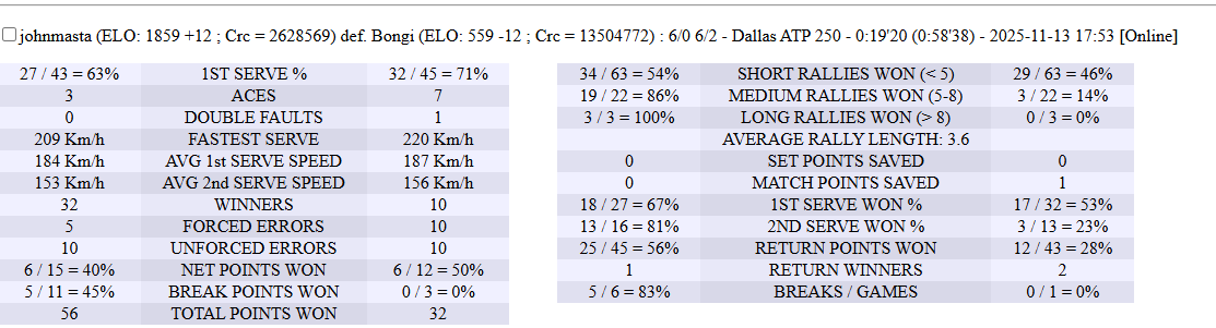| 13.11.2025 | Quarter-Final | johnmasta | Bongi | 6-0,6-2 | |