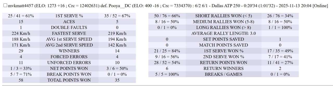 | 13.11.2025 | Quarter-Final | mvkmatt4457 | Pooya_DC | 6-2,6-1 | |