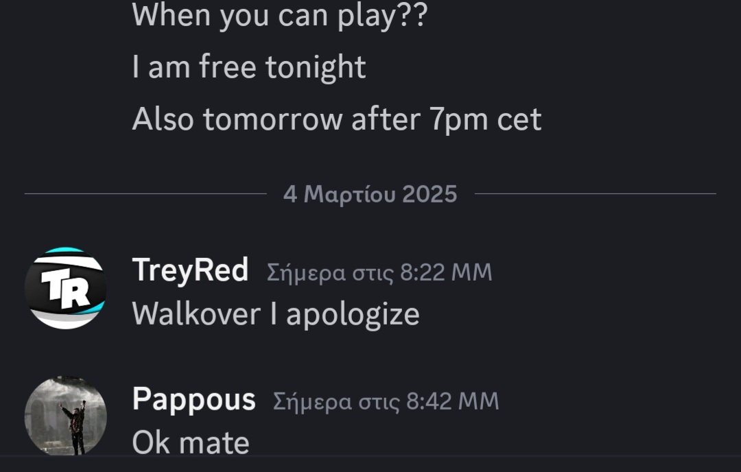 | 04.03.2025 | Quarter-Final | horatio86654 | Greatvalueanakin | Walkover | |