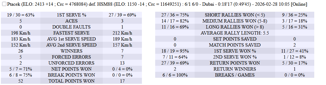 | 28.02.2026 | Round of 32 | Ptacek | HSM09 | 6-1,6-0 | |