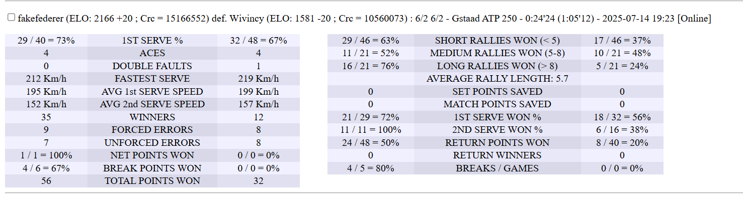 | 14.07.2025 | Round of 16 | fakefederer | Wivincy | 6-2,6-2 | |