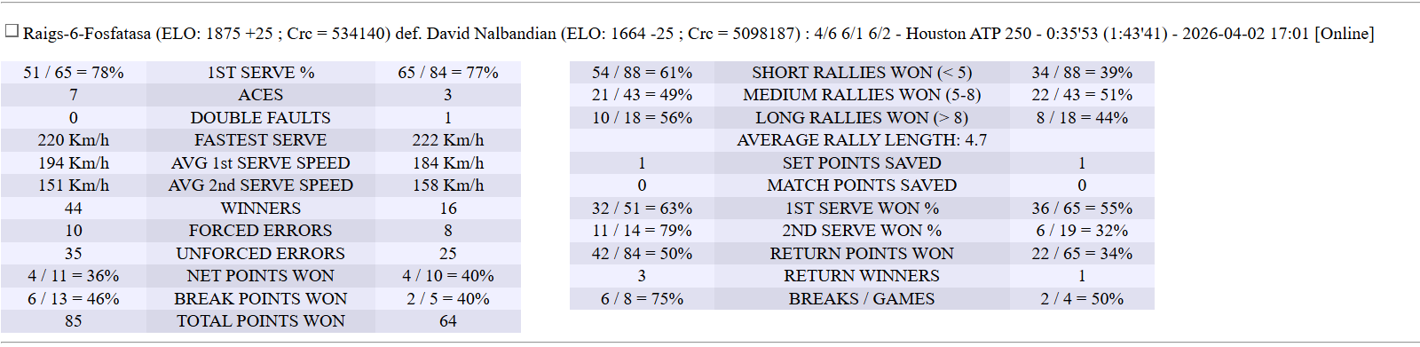 | 02.04.2026 | Quarter-Final | Raigs | Stkst | 6-4,6-1,6-2 | |