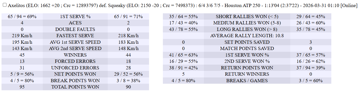 | 31.03.2026 | Quarter-Final | Squeaky | mareasdf | 6-0,6-0 | |