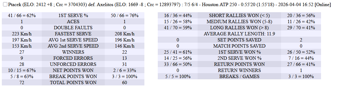 | 04.04.2026 | Final | Ptacek | Axelitos | 7-5,6-4 | |