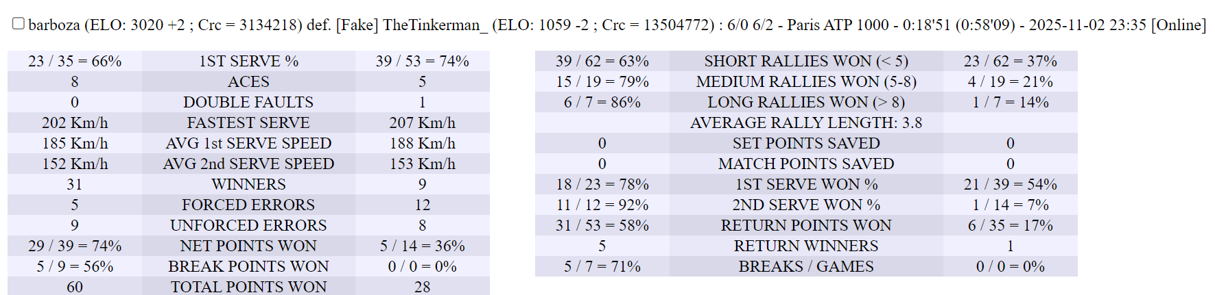 | 04.11.2025 | Round of 32 | Ptacek | fakefederer | 6-0,6-3 | |