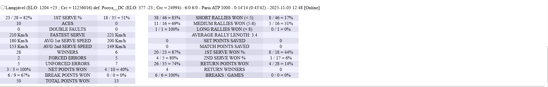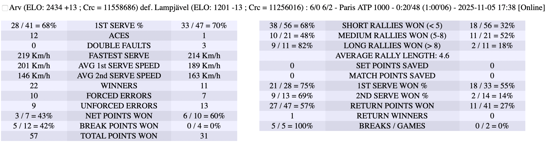 | 10.11.2025 | Semi-Final | GOATBARBOZA | Arv | 7-6,6-3,6-4 | |