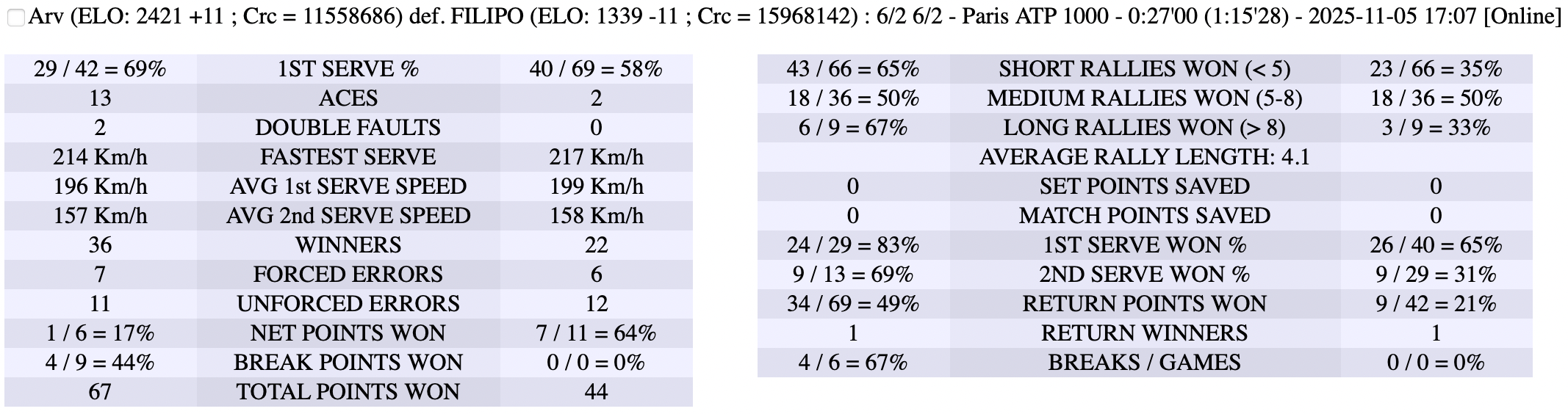 | 06.11.2025 | Round of 16 | Arv | Filipo | 6-2,6-2 | |