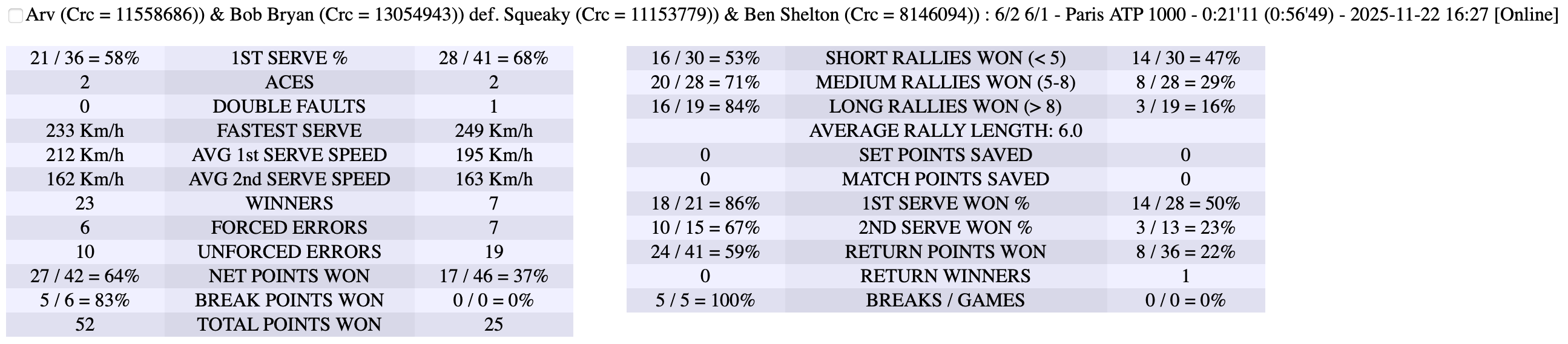 | 20.11.2025 | First Round | Squeaky | Pooya_DC | 6-2,6-2 | |