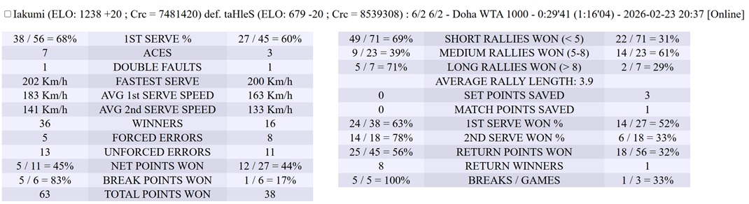 | 24.02.2026 | Round of 32 | Iakumi | taHleS | 6-2,6-2 | |