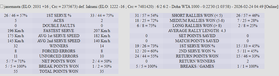 | 24.02.2026 | Round of 16 | janemasta | Iakumi | 6-2,6-2 | |