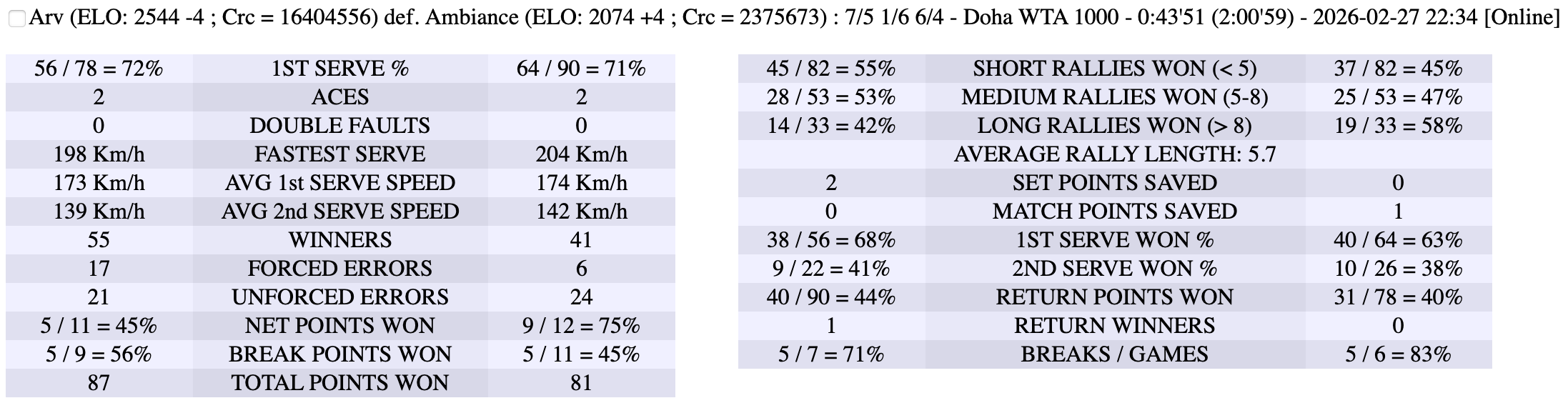 | 28.02.2026 | Quarter-Final | Aryana | Ambiance | 7-5,1-6,6-4 | |