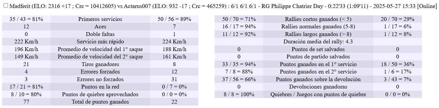 27.05.2025 Round of 64 Madferit Actarus007 6-1,6-1,6-1