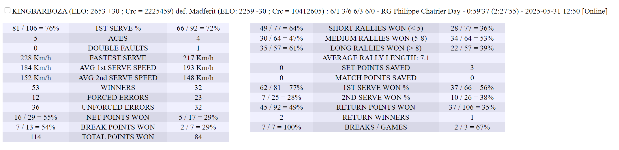31.05.2025 Round of 32 GOATBARBOZA Madferit 6-1,3-6,6-3,6-0