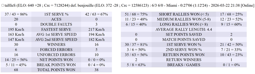 | 22.03.2026 | Round of 32 | taHleS | benjouille | 6-3,6-0 | |