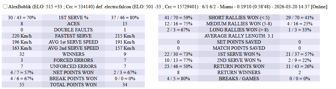 | 20.03.2026 | Round of 32 | AlexBublik | electricfalcon | 6-1,6-2 | |