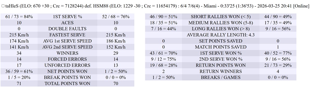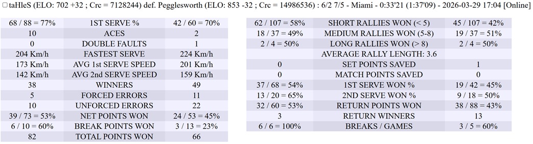 | 20.03.2026 | Round of 32 | Hash | antoniolk | 6-1,6-0 |