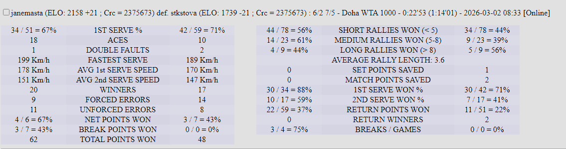 | 02.03.2026 | Quarter-Final | janemasta | stkstova | 6-2,7-5 | |